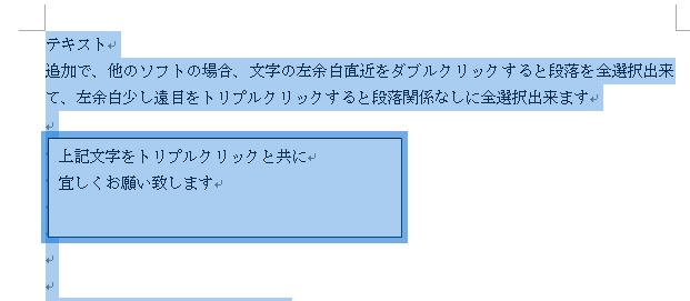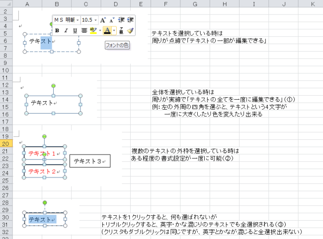 その機能の要望追加ですが ・現在は縦書き・横書き・スタイルまでは変わらないので、全て予めサブツールに設定した書式に変わって欲しい (現状を生かすなら縦横書き・スタイルなどサブツールの各項目にロックがかかる等) ・一つの吹き出し内のテキストを全部いっぺんに書式変更出来る様にして欲しい(図①) ・テキストをドラッグかShiftかCtrlで複数選択してから、サブツールクリックで一度に書式を替えたい(図②) ただ、外枠の選択後サブツールクリックで全テキストが変換出来たり、テキストを選択範囲ドラッグで複数選択して書式変更が出来てしまうと便利だと思いますが、人によっては意図しない所が変換してしまい思わぬトラブルになりそうなのでキャンバス上に入力してあるテキストを「トリプルクリック」するとそのテキスト全体を選んでくれる機能の方が良いかも知れません・・・(図③) せっかく、1クリックでテキスト選択が出来る様になったので、せめて他ソフトと同様にトリプルクリックで全選択して頂けると有難いなと思いました。 もし1つのフキダシ内のテキストレイヤーを全選択する方法がありましたら、ご教授よろしくお願い申し上げます 下図は別ソフトの挙動です。 ------------------------------------------------------------ ■バージョン:1.2.7 ■グレード EX( 〇 ) ■OS Windows 7 (〇)