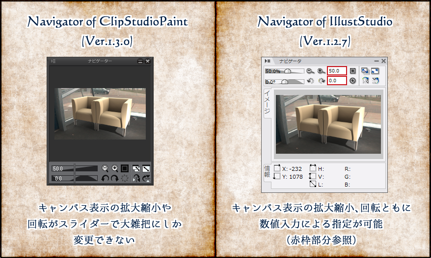 【要望】ナビゲータや画面下の表示倍率やキャンバス回転角度を数値入力で指定したい |