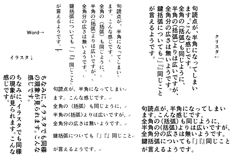 テキストツールで句読点や括弧を使った際、全角分の広さでなく、半角分の広さになってしまいます。 イラスタでも同様の現象が見られるので不具合ではなく仕様かなとも思ったのですが、文字入れの際に行によって文字が合わずに困ることが多いので、改善を要望します。 また、全角だけでなく半角括弧も詰まり気味のようなので、その点も改善お願いします。 クリスタ、Word、イラスタでの比較になります。 イワタアンチック体B、鍵括弧のみメイリオを使用しています。 ![]() ------------------------------------------------------------ ■バージョン:1.3.1 ※[ヘルプ]メニュー → [バージョン情報]で確認できます。 ■グレード DEBUT( ) PRO( ) EX( ○ ) ■OS Windows XP( ) Windows Vista( ) Windows 7 ( ○ ) Windows 8( ) Windows 8.1( ) MacOS X 10.5( ) MacOS X 10.6( ) MacOS X 10.7( ) MacOS X 10.8( ) MacOS X 10.9( ) その他( ) ------------------------------------------------------------ |