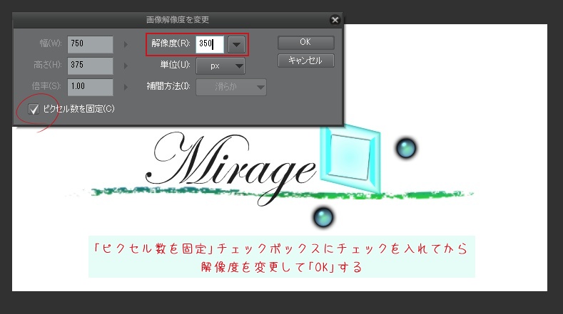 「編集」→「画像解像度を変更」から「ピクセル数を固定」チェックボックスにチェックを入れて