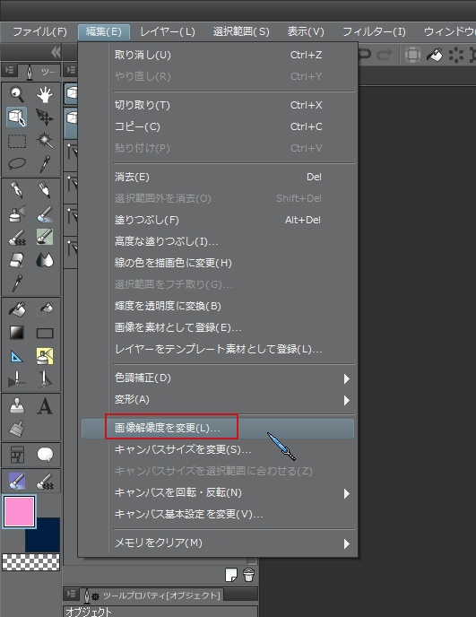 記載いただいた通り、[編集]メニュー→[画像解像度の変更]から