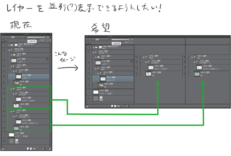レイヤーパレットを複数表示させたり、2列に表示させることはできません。