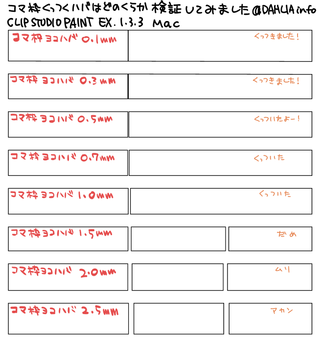 「レイヤー」メニュー>定規・コマ枠>「コマ枠を結合」と言う機能ですが、 Mac版においては「枠線の幅が1.5mm以下でなければ隣のコマとくっつかない」と言う現象が起きています。 ![]() 上下左右ともに枠線の幅1.5mmと言うのは大変狭く、 実用的では無いと感じますので、せめて5〜6mmくらいまで離れたコマでも結合出来るようにしていただきたいです。 この機能はコマ割の表現を色々広げる事の出来るすごい機能だと思います 改善して下さるのを心待ちにしております ------------------------------------------------------------ ■バージョン:1.3.3 ※[ヘルプ]メニュー → [バージョン情報]で確認できます。 ■グレード DEBUT( ) PRO( ) EX( ○ ) ■OS Windows XP( ) Windows Vista( ) Windows 7 ( ) Windows 8( ) Windows 8.1( ) MacOS X 10.5( ) MacOS X 10.6( ) MacOS X 10.7( ) MacOS X 10.8( ) MacOS X 10.9( ○ ) その他( ) ------------------------------------------------------------ |