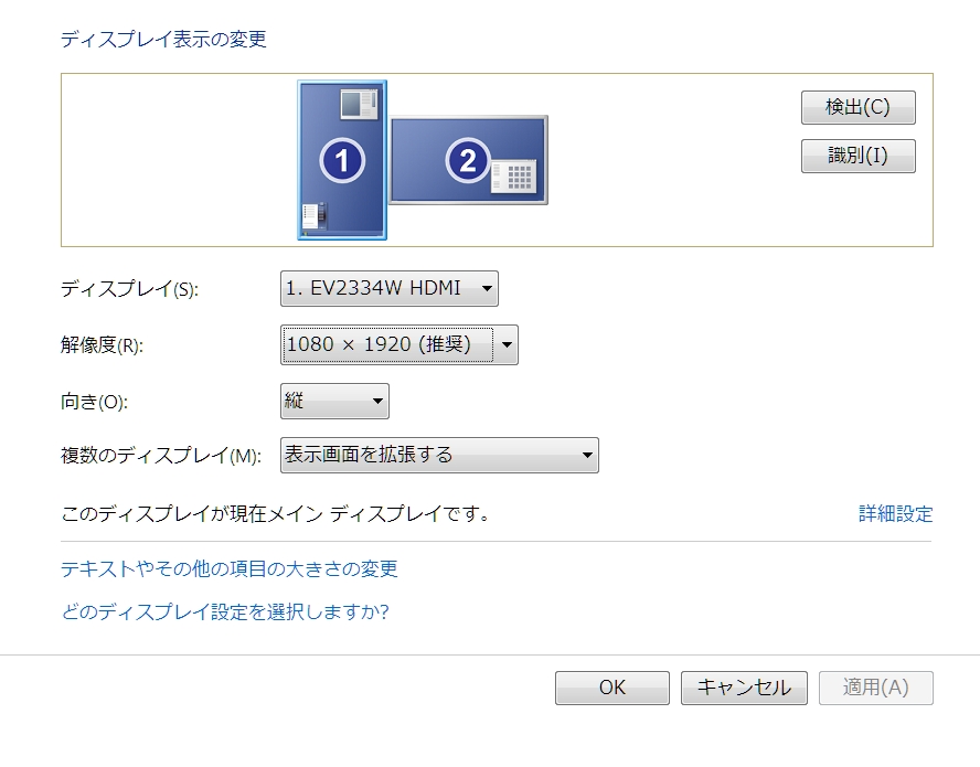 ご使用の場合はディスプレイのメーカー名、型番をお知らせください。デュアルディスプレイです。同じ液晶を2つ接続しています。ナナオ EIZO EV2334W 縦(HDMI)メインディスプレイ ナナオ EIZO EV2334W 横(アナログD端子)サブディスプレイ