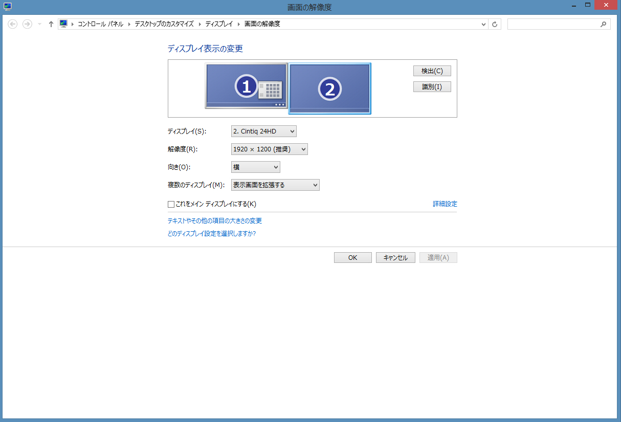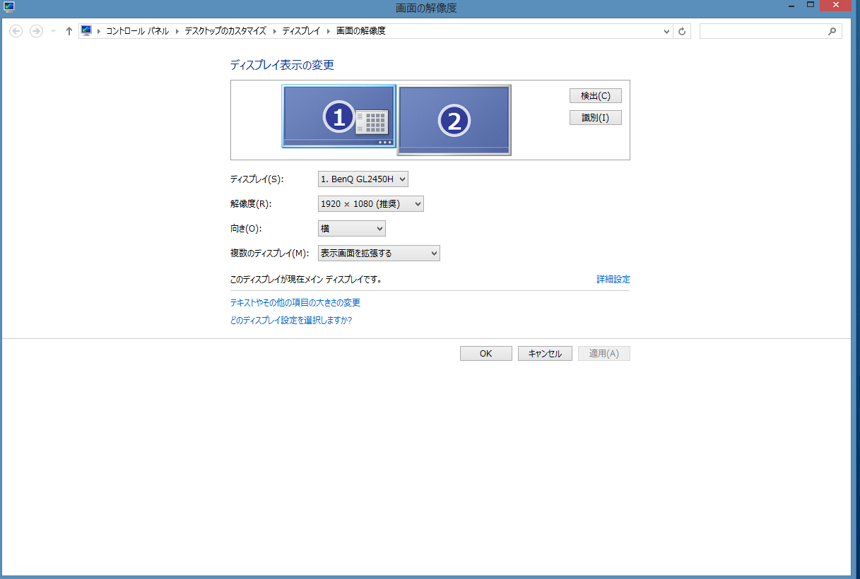 デスクトップの上で右クリック→[画面の解像度]をクリックし