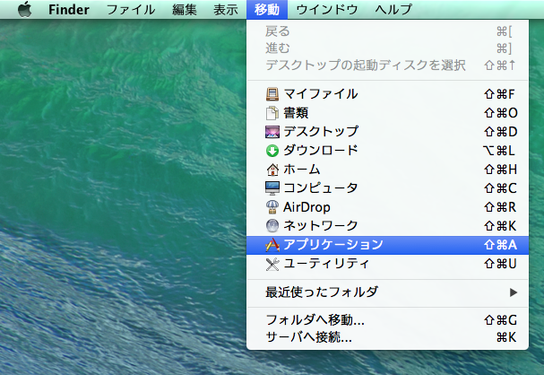 Finderの[移動]メニューから、[アプリケーション]を選択してください。