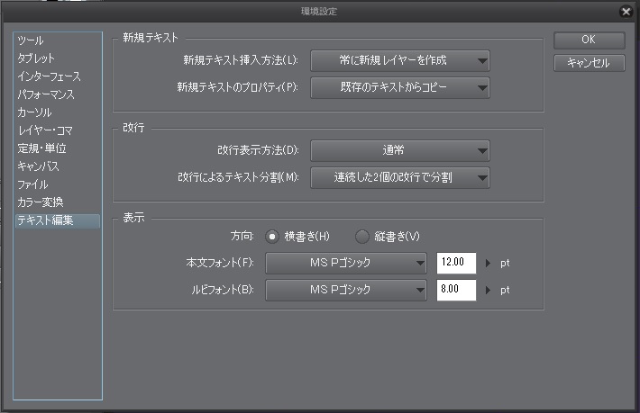 ・[ファイル]メニュー→[環境設定]を選択し、[テキスト編集]を
