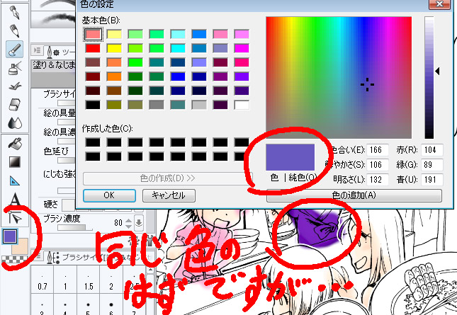 パレット上の選択色に違いがあるのと同じような原理とお考えください。