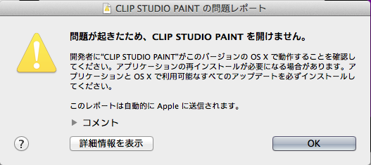 当方、つい先日WindowsPCが壊れてしまい、 Macに以降しようと、DLした次第ですが、インストール後起動しようとしても、 「問題が起きたため、CLIP STUDIO PAINT を開けません。」 と言った内容の問題レポートを提示されるだけで、それより進展する事が出来ません。 アップデートは、Mac、CLIP STUDIO PAINT共に最新の物を適用しております。 当方、機械音痴ゆえ、もし常識の内にある解決法を知らずに聞いている様でしたら、申し訳有りません。 ------------------------------------------------------------ ■OS Windows XP( ) Windows Vista( ) Windows 7 ( ) Windows 8( ) Windows 8.1( ) MacOS X 10.5( ) MacOS X 10.6( ) MacOS X 10.7( ) MacOS X 10.8( ) MacOS X 10.9( ○ ) その他( ) ------------------------------------------------------------ |