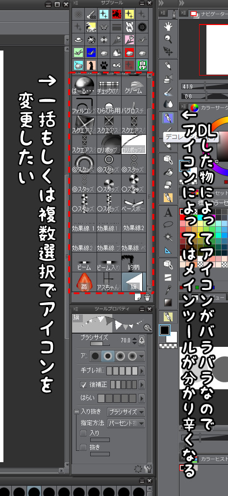 何時もお世話になっております。素材など整理している時に、毎度面倒に思う事が有りまして この度書き込ませて頂きました。 コレはクリップスタジオとペイント両方にお願いしたい機能なのですが、 例えば、テクスチャ画像の素材集を複数名から大量にDlさせて頂いた後、カラーパターンフォルダーに移動したい時等 フォルダー複数選択して移動できたら良いのにと思うことが多々御座います。 ![]() 素材一個一個表示されているの方では複数選択はできますが、素材集のフォルダーごとの方が 移動漏れを防げますし、楽に移動出来るので…。 2)サブツールのアイコンを一括で変更したい。 ![]() DLさせて頂いたツール製作者様によってアイコンがバラバラだったり、 自分としてはこのテーマはコレに統一しておきたいと 思うときにサブツールごと一括(もしくは複数選択で)アイコン変更が出来たらイイなと思います。 画像の様に一瞬ドレがデコレーションツールだったか分からなくなる事が多々あるので…。 素材を手軽に管理・整理出来ると作業効率も良くなりますし、是非ともご検討頂けると幸いです。 ------------------------------------------------------------ ■バージョン: ※[ヘルプ]メニュー → [バージョン情報]で確認できます。 Ver1.3.9 ■グレード DEBUT( ) PRO( ) EX( ○ ) ■OS Windows XP( ) Windows Vista( ) Windows 7 (○) Windows 8( ) Windows 8.1( ) MacOS X 10.5( ) MacOS X 10.6( ) MacOS X 10.7( ) MacOS X 10.8( ) MacOS X 10.9( ) その他( ) ------------------------------------------------------------ |