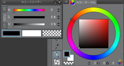 ==================================================== 確認しやすいようにカラーサークルとカラースライダーを並べます カラースライダーから操作してS(彩度)とV(明度)を0にします マウスでドラッグしてH(色相)を増やしてから0にします カラースライダーとカラーサークルのH(色相)数値がズレます http://i.imgur.com/RCz3BET.jpg ==================================================== どうやらS(彩度)とV(明度)が0の時に、 カラースライダーでH(色相)を0にするとカラーサークルは変化しないようで 数値を直接入力してもカラーサークルに変化はありません また、H(色相)とV(明度)を0にしてS(彩度)で同じことをしても 同様の現象になりました だから何だ?色は変わらないだろと言われると、 …え、あ、はい。としか言えませんが個人的に気になってしまったので ------------------------------------------------------------ ■バージョン:1.3.6 ※[ヘルプ]メニュー → [バージョン情報]で確認できます。 ■グレード DEBUT( ) PRO( ) EX( ○ ) ■OS Windows XP( ) Windows Vista( ) Windows 7 ( ○ ) Windows 8( ) Windows 8.1( ) MacOS X 10.5( ) MacOS X 10.6( ) MacOS X 10.7( ) MacOS X 10.8( ) MacOS X 10.9( ) その他( ) ------------------------------------------------------------ |