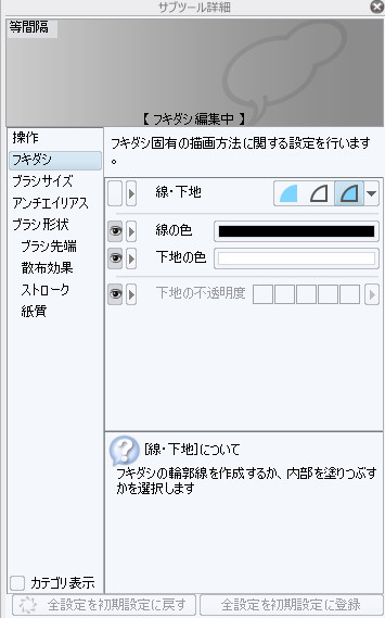 吹き出しから背景の絵が写る様に下地の透明度を変更しようとして http://www.clip-studio.com/clip_site/support/faq/detail/svc/52/tid/67746 こちらの質問から同じ様に設定をしようとしたのですが 下地の不透明度の設定箇所を弄る事ができません。 灰色文字になってしまっています。。 ![]() どうすれば不透明度を弄れるようになりますか 対処方法知ってる方、もしくはサポート担当者様よろしくお願いします>< ------------------------------------------------------------ ■バージョン: ※[ヘルプ]メニュー → [バージョン情報]で確認できます。 ■グレード DEBUT( ) PRO(1.3.9) EX( ) ■OS Windows XP( ) Windows Vista( ) Windows 7 ( ) Windows 8( ) Windows 8.1(〇) MacOS X 10.5( ) MacOS X 10.6( ) MacOS X 10.7( ) MacOS X 10.8( ) MacOS X 10.9( ) MacOS X 10.10( ) その他( ) ------------------------------------------------------------ |