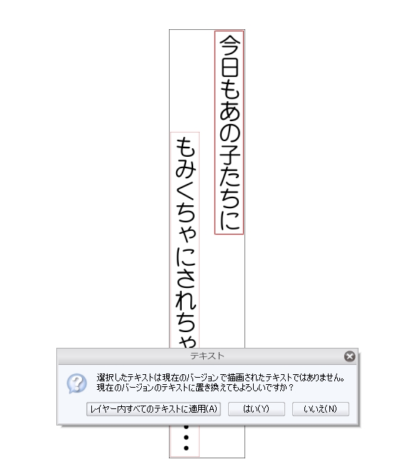 「選択したテキストは現在のバージョンで描画されたテキストではありません」と通知が出ます |