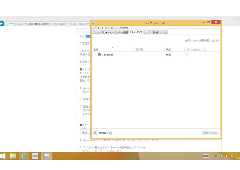 上記の症状はクリスタを終了後も継続し、win8.1環境のサフプロ2上での作業全体に不具合が生じ事実上使用不可となる。 この症状を解消するためサフプロの再起動を行うと、症状は解消される。 ただしその後、クリスタ以外のソフトを使用中は再発しないが、再びクリスタを使用すると、使用後数分で上記症状になる。