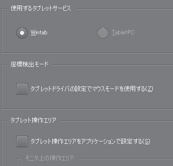 まず、「使用するタブレットサービス」は「Wintab」になっています。(TabletPCはグレーアウトしています)