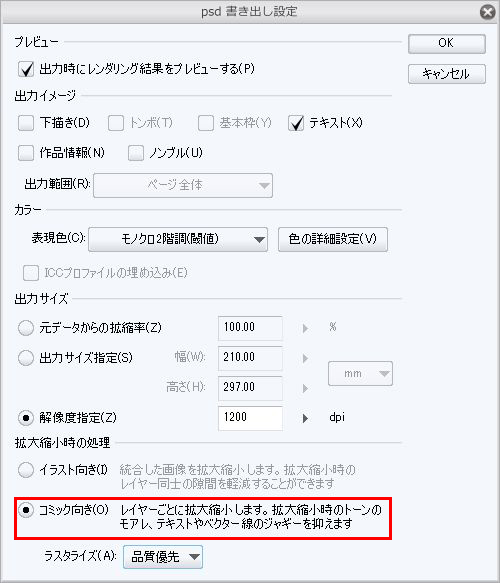 トーン部分やベクターレイヤーを劣化させずに解像度変換する場合は、