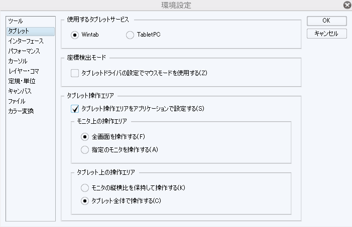 指定の項目を書き出す途中、[ファイル]メニュー→[環境設定]→[タブレット]を確認した際の設定が