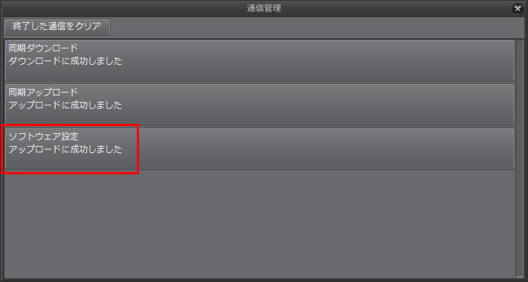 この際、[通信管理]画面で下図のようにソフトウェア設定のアップロードに