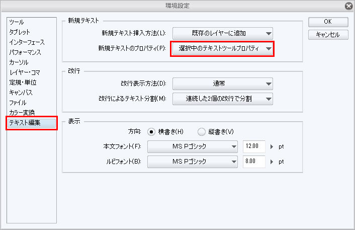3.新規テキストのプロパティを[選択中のテキストツールプロパティ]に変更し、