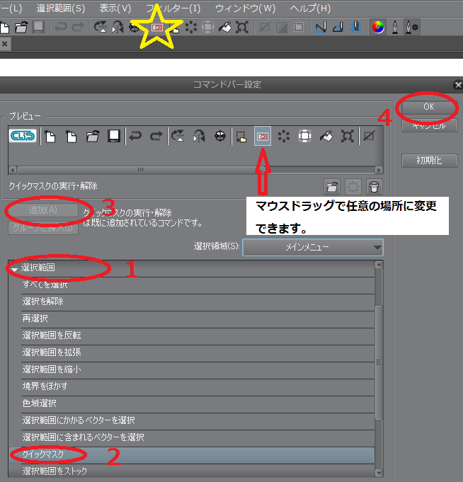 CLIP STUDIO PANTのツールパレットは自由にカスタマイズできるためか ComicStudioのカスタムツールパレットに相当する機能がありませんが、 コマンドバーのメニューをツールパレットに登録できないのは非常に不便なので 登録できるように改善して頂けないでしょうか? 具体的には、私は「クイックマスク」ボタンをツールバーに配置したいです。 Photoshopなどには初期状態で用意されています。