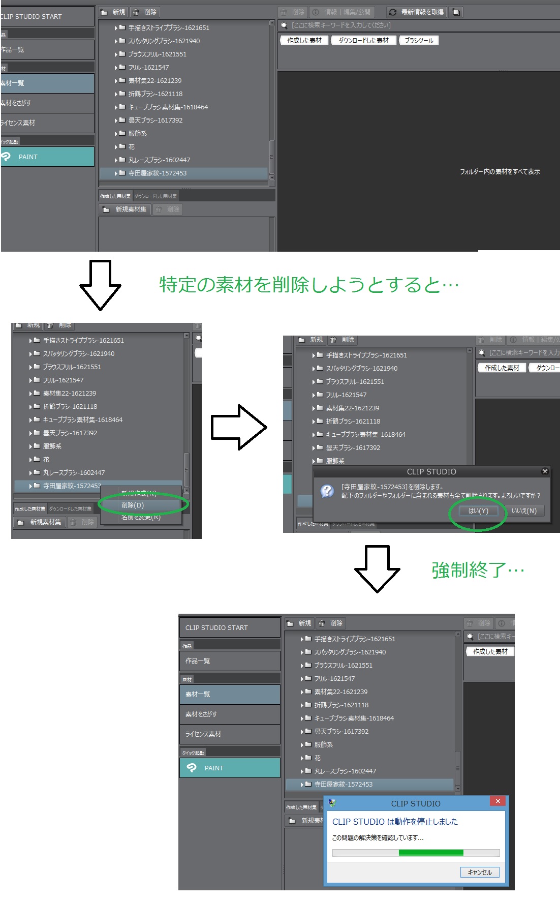 CLIP STUDIO(又はCLIP STUDIO Paint)上で特定の素材フォルダや素材を削除すると 下記のように強制終了します。 現在のバージョンは1.41ですが少し前のバージョンでも同様の現象が起きてました。 これじゃ素材整理したくても強制終了がこわくてできないのでなんとかしてほしいです