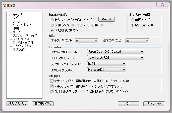 アニメ化機能もいいですが 環境設定に起動時の動作を早めに追加してください。 (添付画像はillustStudioの物) ![]() ------------------------------------------------------------ ■バージョン:1.4.2 ※[ヘルプ]メニュー → [バージョン情報]で確認できます。 ■グレード DEBUT( ) PRO( ) EX( ○ ) ■OS Windows XP( ) Windows Vista( ) Windows 7 (○ ) Windows 8( ) Windows 8.1( ) Windows 10( ) MacOS X 10.5( ) MacOS X 10.6( ) MacOS X 10.7( ) MacOS X 10.8( ) MacOS X 10.9( ) MacOS X 10.10( ) その他( ) ------------------------------------------------------------ |