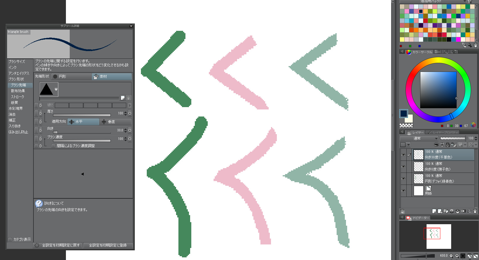 こうして作成した三角形パターンのブラシを実際に使用してみると以下のようになります。