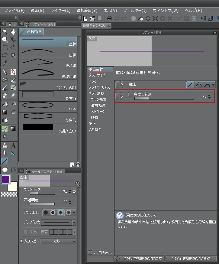 それと直線ツールは初期状態では「角度の刻み」