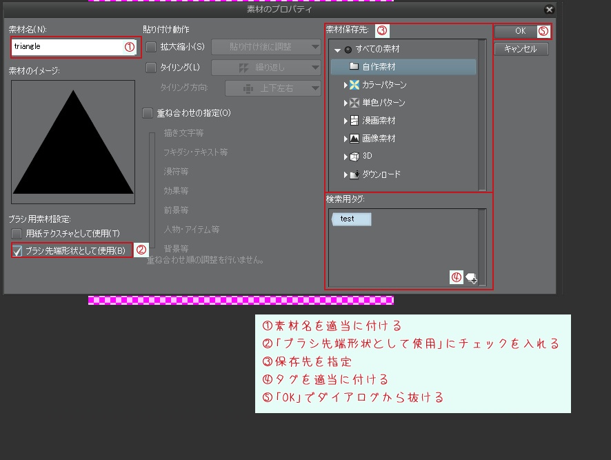 4.「素材のプロパティ」ダイアログから素材名(ブラシパターン名)を付けたあと