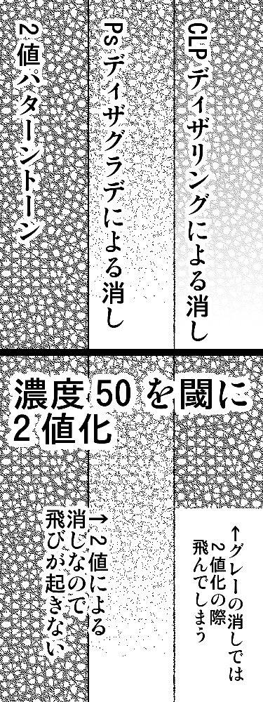 長くセルシス様のアプリにはお世話になっています 現在漫画制作におけるペン入れまでの作業をComicStudio、トーンと仕上げ作業を CLIP STUDIO PAINT(以下CSP)とPhotoshop(以下Ps)で行っています 要望はPsにある合成モードのディザをCSPにも導入して頂けないかということです 既にあるようでしたら不勉強で申し訳ありません 現在グレーのグラデーションは空やガラス、水面など質感がなめらかな物を合成モード「通常」 壁面地面などのザラリとした質感を出したいときなどは「ディザ」を用いています B4、600dpiの原稿で作業していますが単行本サイズの印刷でもしっかり質感の違いが出ます またディザ合成によるグラデは通常合成によるグラデを網点化した場合、昔一部の印刷所で出たグラデーションの飛び (例えば0~5%までの網点が一定の大きさで印刷しされてしまい綺麗に階調が出ない) などの不具合を回避するのにも使えました 塗りつぶしたり選択範囲をとるのはCSPがとても優れているのですが 今はディザグラデのためPsに戻らなければならずとても手間になっています ご検討頂けますと大幅に効率が上がり有り難いです ------------------------------------------------------------ ■バージョン: 1.3.4 ■グレード DEBUT( ) PRO( ) EX(○ ) ■OS Windows XP( ) Windows Vista( ) Windows 7 ( ○ ) Windows 8( ) Windows 8.1( ) Windows 10( ) MacOS X 10.5( ) MacOS X 10.6( ) MacOS X 10.7( ) MacOS X 10.8( ) MacOS X 10.9( ) MacOS X 10.10( ) その他( ) ------------------------------------------------------------ |