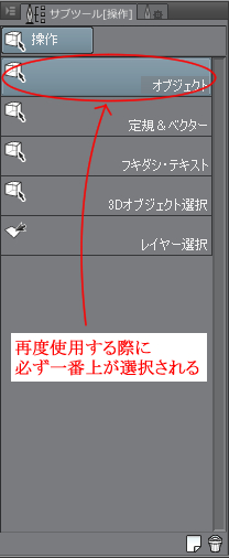[操作]ツールについては[サブツール]の[オブジェクト]に「O」、