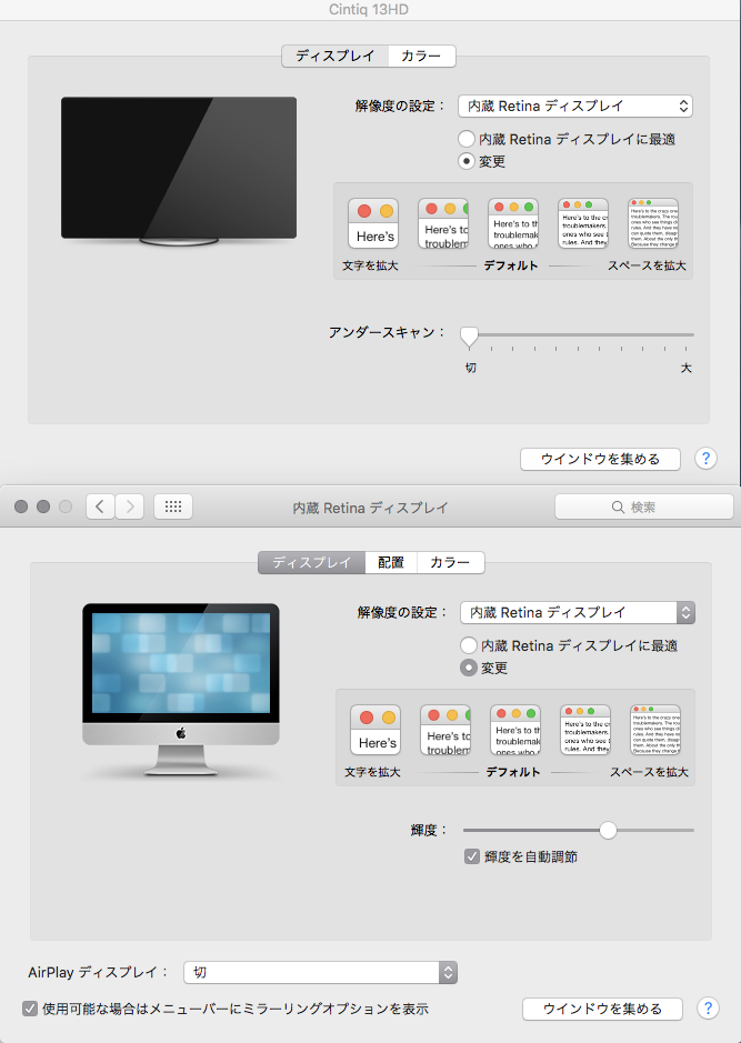 そして、システム環境設定のディスプレイで、「解像度の設定」を内蔵RetinaディスプレイからCintiq13HDに切り替えると、