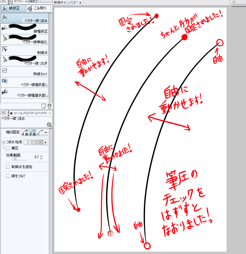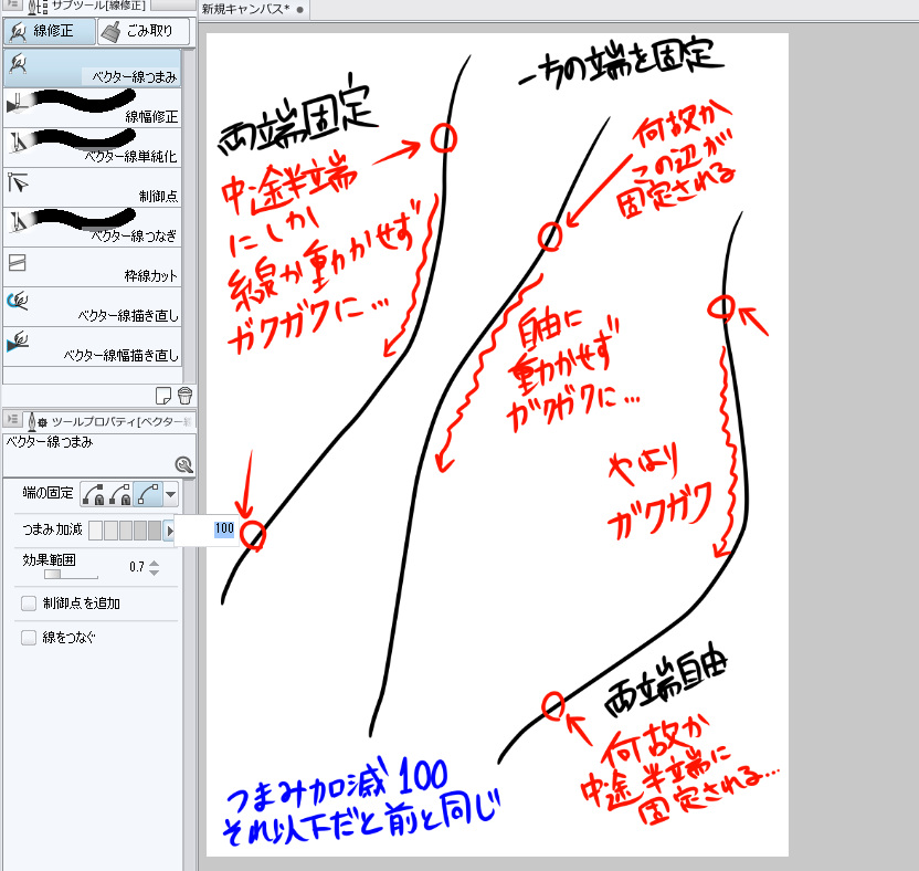 お世話になっております。 不具合ですが、ベクター線つまみの機能が文字通りおかしくなりました。 両端の固定、一方の端を固定、両端自由のどれを使用してもベクター線が途中でつままれるという現象が発生しました。 画像の通りです。 ![]() ソフトの再起動、ツールの初期化、PCの再起動など出来る限りのことは尽くしました。 ペンがおかしいのかと思い、他のペンでベクター線を引いても同じ現象が発生しました。 べクター線つまみツールの便利な機能には大変助けられていたのでこの様な不具合が発生して非常に残念です。 出来る限り早めの対策、解決策を教えて頂ければ幸いです。 よろしくお願いします。 ------------------------------------------------------------ ■バージョン:1.5.1 ※[ヘルプ]メニュー → [バージョン情報]で確認できます。 ■グレード DEBUT( ) comico( ) PRO( ○ ) EX( ) ■OS Windows XP( ) Windows Vista( ) Windows 7 ( ○ ) Windows 8( ) Windows 8.1( ) Windows 10( ) MacOS X 10.5( ) MacOS X 10.6( ) MacOS X 10.7( ) MacOS X 10.8( ) MacOS X 10.9( ) MacOS X 10.10( ) MacOS X 10.11( ) その他( ) ------------------------------------------------------------ |
