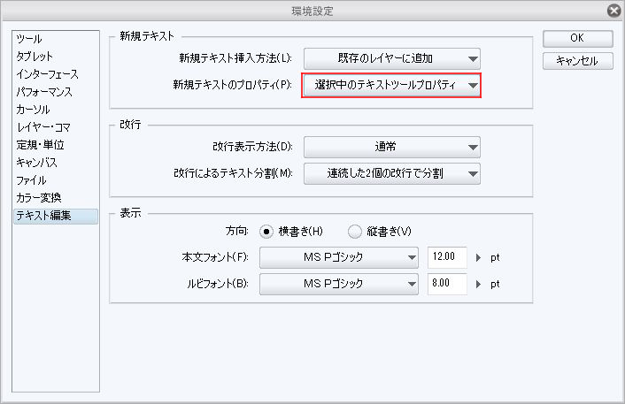 環境設定の[テキスト編集]で、新規テキストのプロパティを