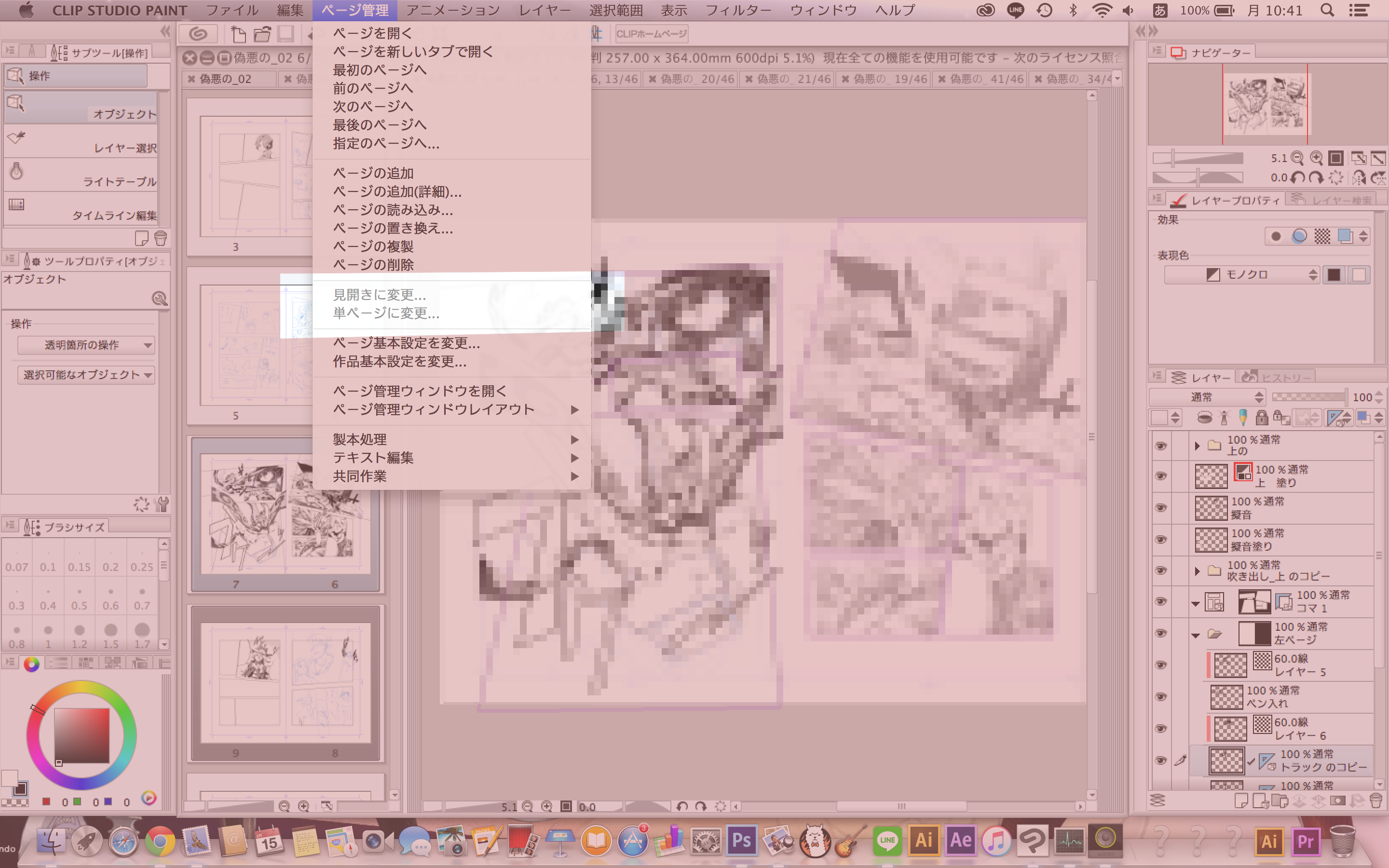 見開きにしたページを、単ページに戻せません(その逆も然りです)。添付した画像のように、「見開きに変更」「単ページに変更」どちらも文字が灰色になって使用できません。回答よろしくお願いします。![]() ------------------------------------------------------------ ■バージョン: ※Windowsは、[ヘルプ]メニュー → [バージョン情報]で確認できます。 ※MacOSXは、[CLIP STUDIO PAINT]メニュー → [バージョン情報]で確認できます。 ■グレード DEBUT( ) comico( ) PRO( ) EX( ◯ ) ■OS Windows XP( ) Windows Vista( ) Windows 7 ( ) Windows 8( ) Windows 8.1( ) Windows 10( ) MacOS X 10.5( ) MacOS X 10.6( ) MacOS X 10.7( ) MacOS X 10.8( ) MacOS X 10.9( ◯ ) MacOS X 10.10( ) MacOS X 10.11( ) その他( ) ------------------------------------------------------------ |