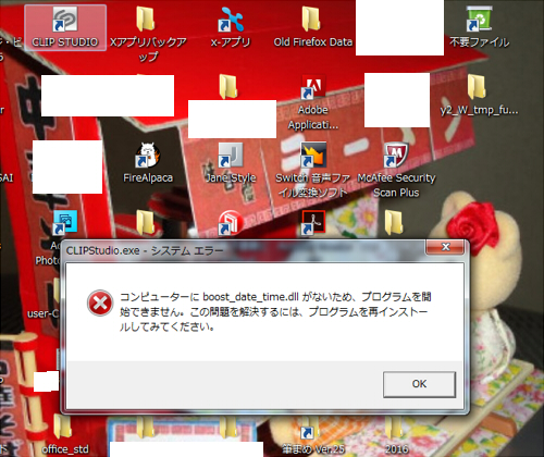 Ver1.54にアップデートしたらシステムエラーが出て「boost_chrono.dllがないため、プログラムを開始できません。この問題を解決するには、プログラムを再インストールしてみてください。」とメッセージが出ました。 クリペはコミスタからの無償サービス版EXを使っているのですが、クリペアンインストール→再インストールになる場合無償は無効になってしまうのでしょうか? システム的なこともわからないのでよろしくお願いいたします。 ------------------------------------------------------------ ■バージョン: ※Windowsは、[ヘルプ]メニュー → [バージョン情報]で確認できます。 ※MacOSXは、[CLIP STUDIO PAINT]メニュー → [バージョン情報]で確認できます。 ■グレード DEBUT( ) comico( ) PRO(○ ) EX( ) ■OS Windows XP( ) Windows Vista( ) Windows 7 ( ○、64ビット ) Windows 8( ) Windows 8.1( ) Windows 10( ) MacOS X 10.5( ) MacOS X 10.6( ) MacOS X 10.7( ) MacOS X 10.8( ) MacOS X 10.9( ) MacOS X 10.10( ) MacOS X 10.11( ) その他( ) ------------------------------------------------------------ |