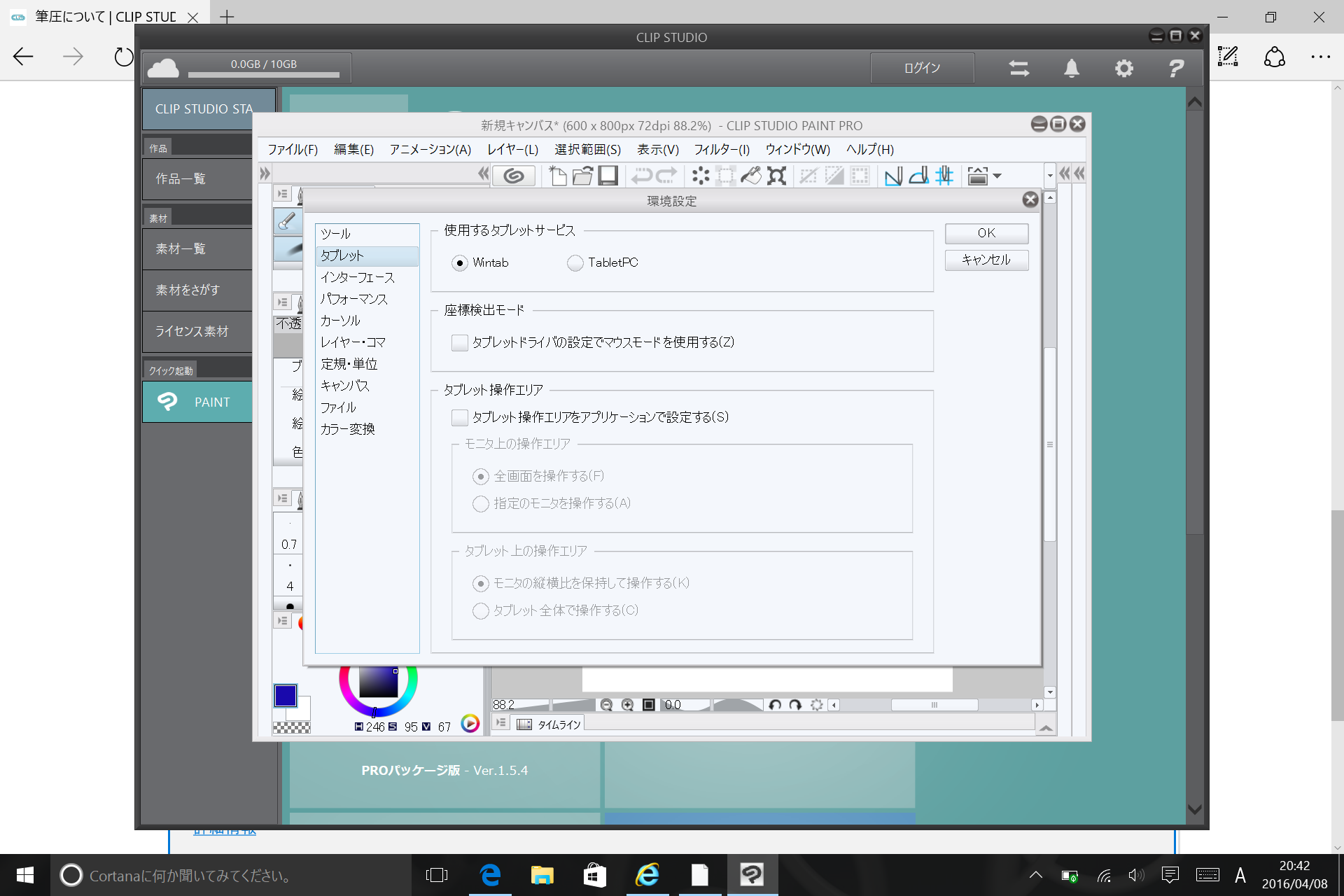 ・[ファイル]メニュー→[環境設定]→[タブレット]を開いた状態の