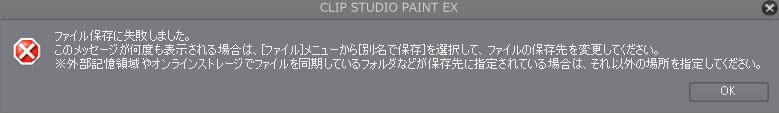 ファイル保存をしようとすると時々「ファイル保存に失敗しました」とメッセージが出て保存できません。 内容的には画像のようなエラーメッセージが出ます。