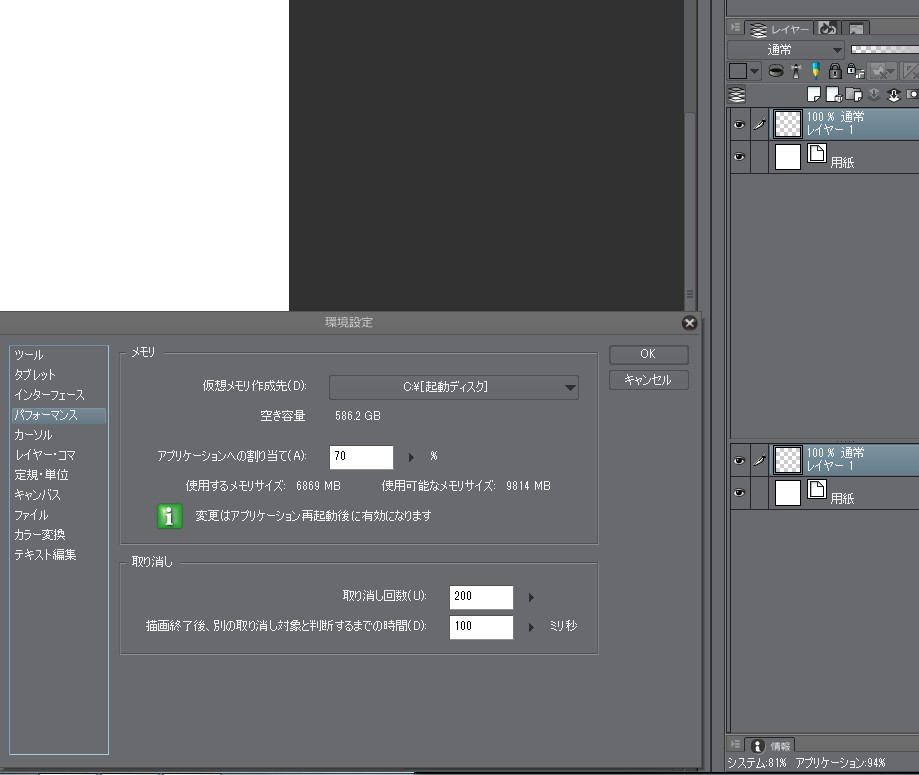 B4モノクロ600dpiで漫画を描いています。1ページのファイルサイズは70MBくらいレイヤー数も50程です。 ペイントを立ち上げた直後はシステム45%アプリケーション15%くらいでサクサク動くのですが 主に拡大縮小をしている時に遅延が発生し、どんどん動きが重くなってくるとともに アプリケーションの数値も上昇し100%になったまま下がらなくなります。開いているファイルをすべて閉じても下がりません。 漫画は小さい隙間までちゃんとトーンがはれているか等、拡大縮小を頻繁に繰り返すので作業が妨害され困っています。 ペイントを終了して立ち上げ直せば元に戻りますがまたすぐなってしまいます。 ちなみにですが、カラー350dpiですとこれより数倍重いファイルサイズでもアプリケーションは45%程度で拡大縮小しても重くなることはありません。 600dpiならばしょうがない事なのでしょうか? たった1ファイルしか開いてなくてこれでは困ります。 もう一つ、ツールを選択する時も読み込みが発生しアプリケーションの数値が上がります。 こちらはダウンロードしたツール数が単純に膨大になっているからだと思うのですが、環境設定を見ると500GB以上空きがあります。 例え容量に余裕があってもツールはたくさん入れると良くないという事なのでしょうか? そしてツールの数を減らせば単純にアプリケーションへの負担は減りますか? 動作が重いと感じるのはこの2点の時だけです。描画などには問題ありません。 何か解決策があれば教えてください。 申し訳ありませんが現在作業中で時間がなくソフトを再インストールなどは出来るだけしたくありません。 応急処置でもいいので思い当たる解決策を教えていただきたいです。 以下環境です。 ![]() ![]() CSP_155w_ ワコムintuos5touch PTH-650 ドライバ6.3.15-3 ウイルスバスターは除外済みです。 アプリケーションへの割り当てを90に変更しても変わりませんでした。 拡大縮小の遅延はマウスホイールでも出ます。 ------------------------------------------------------------ ■バージョン: ※Windowsは、[ヘルプ]メニュー → [バージョン情報]で確認できます。 ※MacOSXは、[CLIP STUDIO PAINT]メニュー → [バージョン情報]で確認できます。 ■グレード DEBUT( ) comico( ) PRO( ) EX(〇 ) ■OS Windows XP( ) Windows Vista( ) Windows 7 ( 〇 ) Windows 8( ) Windows 8.1( ) Windows 10( ) MacOS X 10.5( ) MacOS X 10.6( ) MacOS X 10.7( ) MacOS X 10.8( ) MacOS X 10.9( ) MacOS X 10.10( ) MacOS X 10.11( ) その他( ) ------------------------------------------------------------ |
