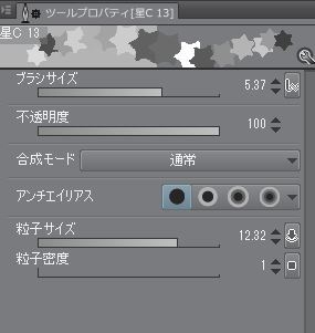 このような感じのブラシをアンチエイリアスなしで描画したいのですが ![]() ![]() 実際に設定して書いたのがこちらになってました。 ![]() ![]() これはアンチエイリアスなしの設定とは違うと思いますので、修正お願いしたいです。 ブラシ濃度100%グレースケール描画したこのような画像に、 グラデーションマップを適用し背景素材として使いたいのですが アンチエイリアス入ってる設定ですと、合成の兼ね合いでノイズが入ってしまうので アンチエイリアスなし設定で描画し合成後にスムージングフィルタを適用させようとしたところ、 アンチエイリアスがかかってることがわかりました。 ご確認お願いいたします。 ------------------------------------------------------------ ■バージョン:1.55 ※Windowsは、[ヘルプ]メニュー → [バージョン情報]で確認できます。 ※MacOSXは、[CLIP STUDIO PAINT]メニュー → [バージョン情報]で確認できます。 ■グレード DEBUT( ) comico( ) PRO( ) EX( ◎ ) ■OS Windows XP( ) Windows Vista( ) Windows 7 (◎) Windows 8( ) Windows 8.1( ) Windows 10( ) MacOS X 10.5( ) MacOS X 10.6( ) MacOS X 10.7( ) MacOS X 10.8( ) MacOS X 10.9( ) MacOS X 10.10( ) MacOS X 10.11( ) その他( ) ------------------------------------------------------------ |