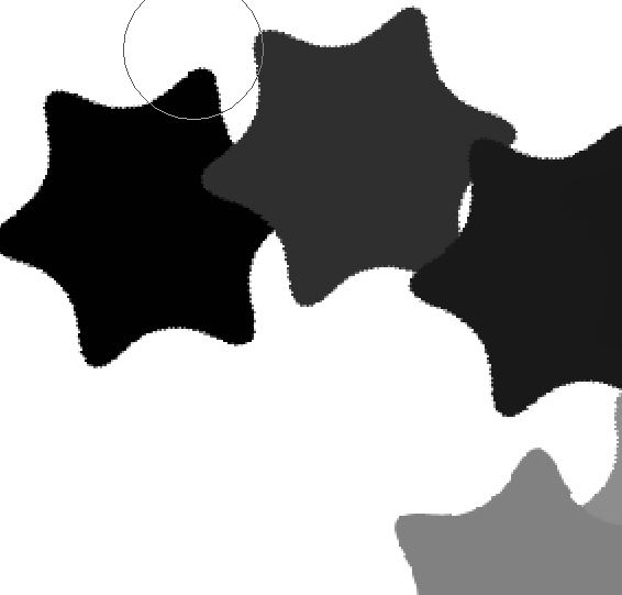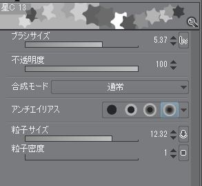 お手数ですが、ブラシの先端画像を作成する際に、アンチエイリアスを切ったペン・図形設定で