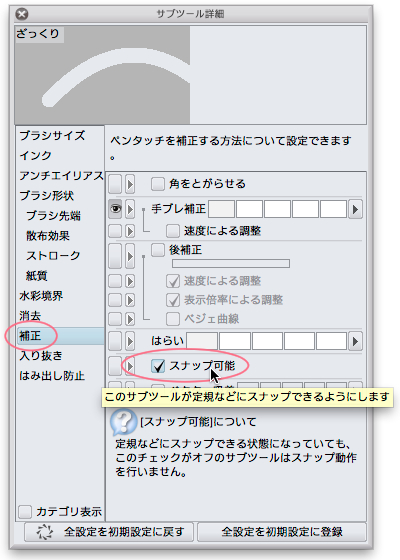 サブツール詳細の「補正」で「スナップ可能」にチェックを入れることで