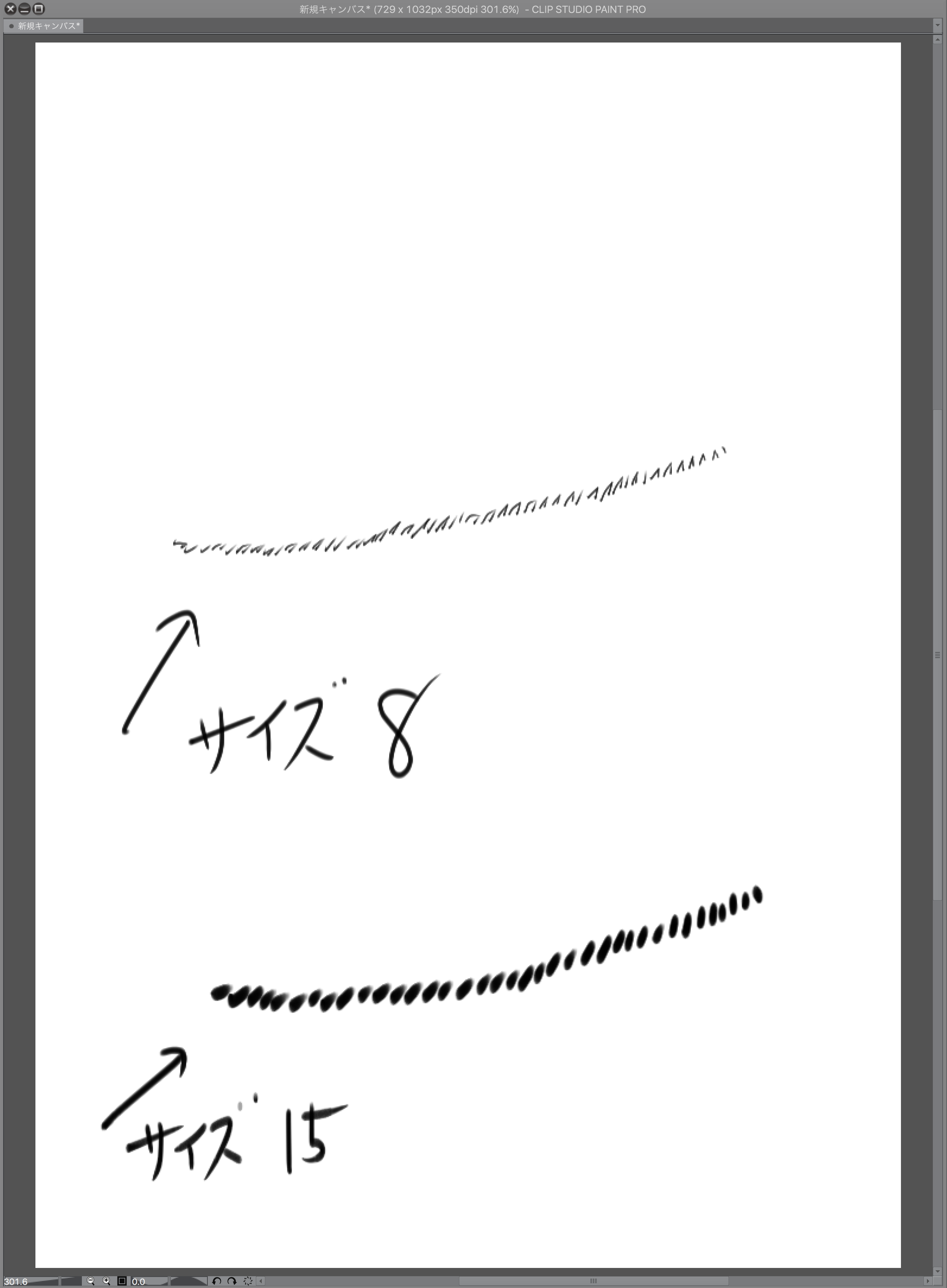 ブラシサイズの問題ではないです。描画サイズ、元キャンバスサイズじゃなくキャンバス表示サイズ(大きい小さいブラシでも実描画表示、ディスプレイサイズに対して小さく表示すること)が小さい時に、連続ちょんちょんちょんストロークができないんです。キャンバスサイズを小さいの〜B3にしても同じ症状、解像度dpiも小〜大でも効果なし。