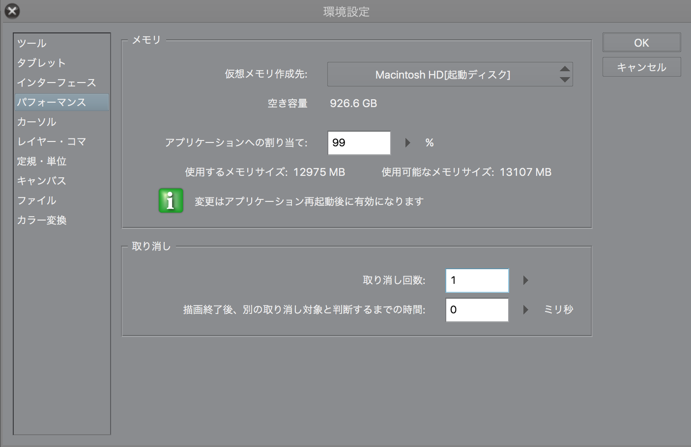 ・[環境設定]の[パフォーマンス]を選択いただいた状態の画面の