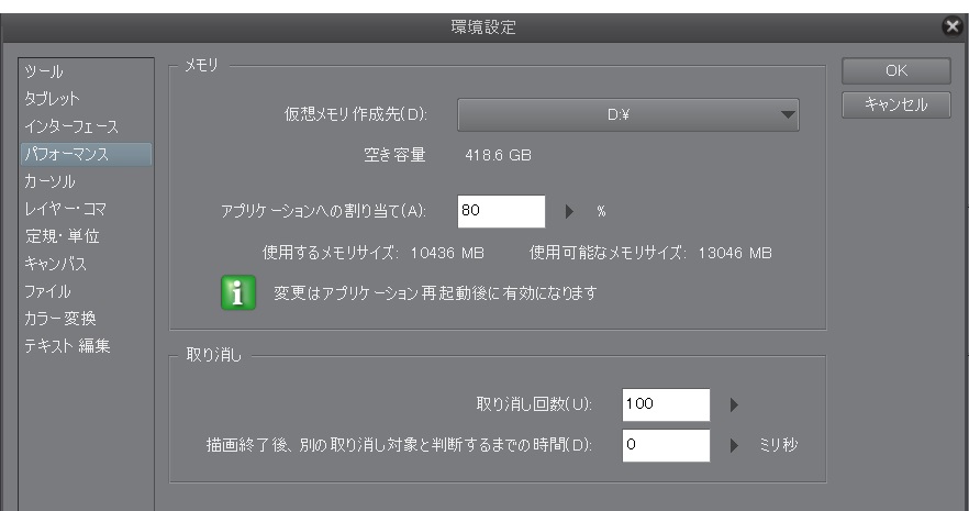 仮想メモリ作製先、取り消し回数についての質問です。