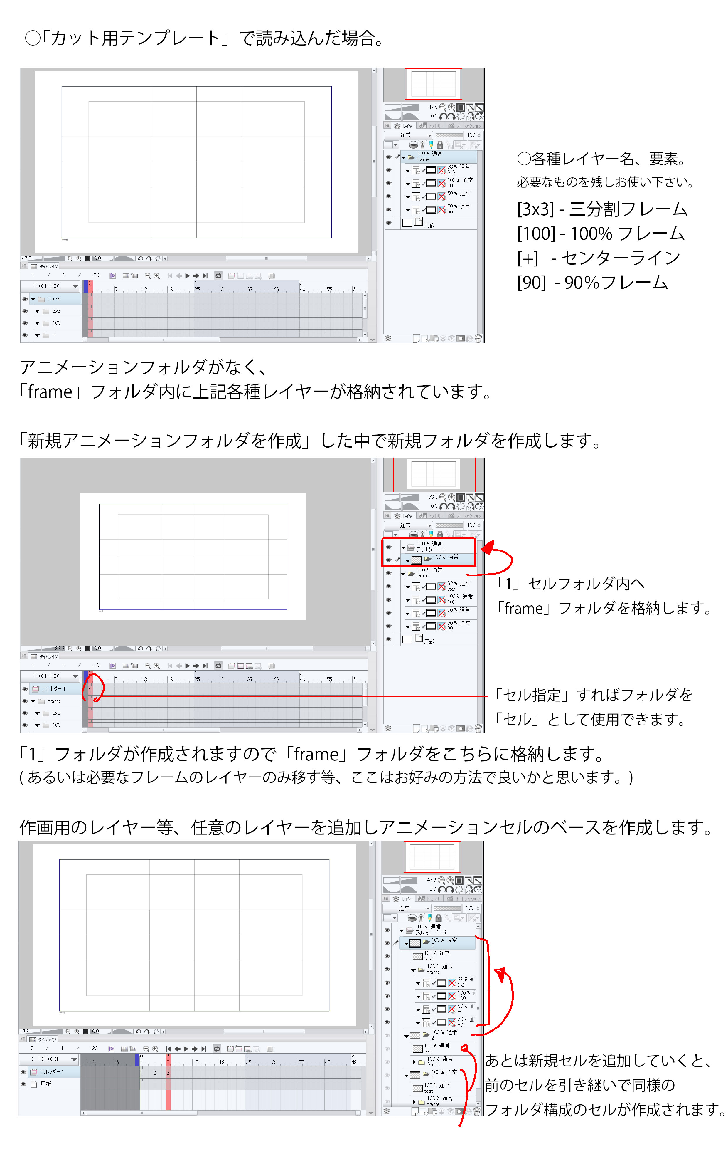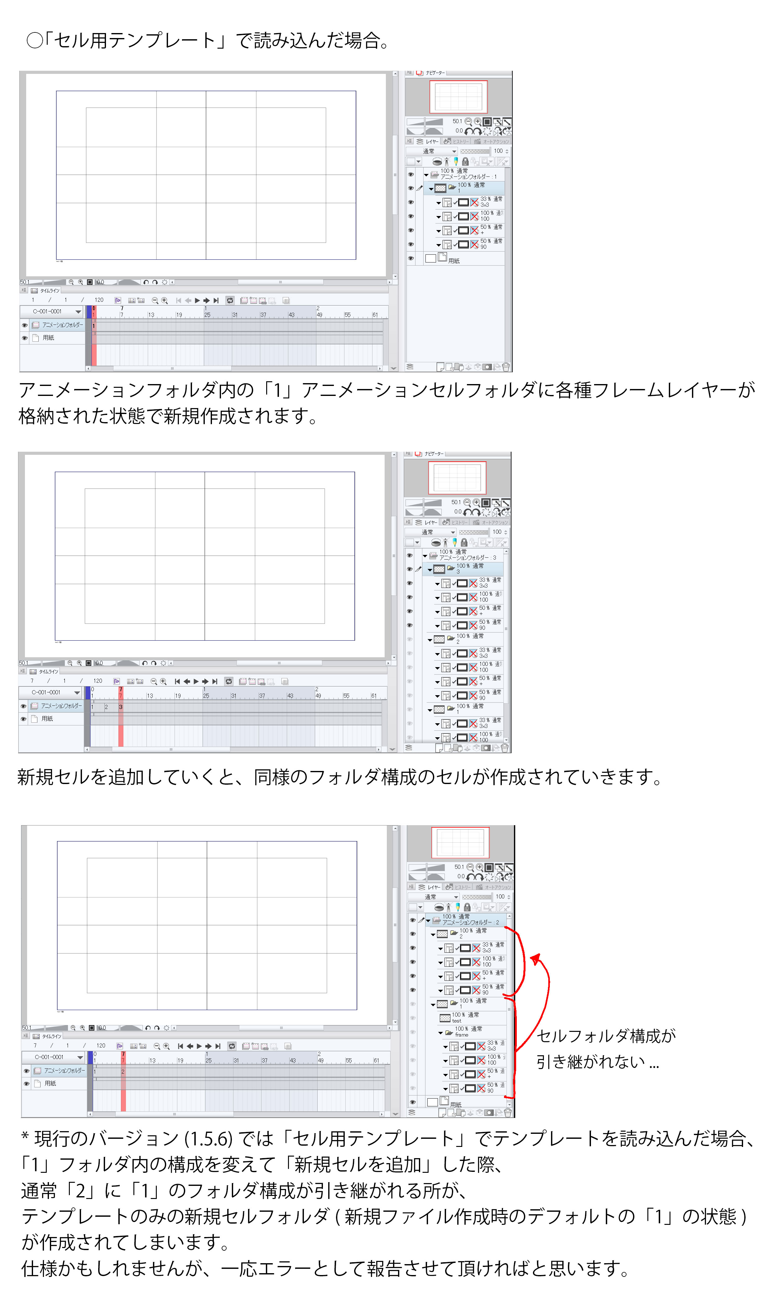 現在、テンプレート機能を自作のテンプレートフレームでテストしてみているのですが、 「セル用テンプレート」で読み込んだ場合、 「1」フォルダ内に新規フォルダ内にテンプレートを格納したりレイヤーを追加するなど、 フォルダの構成を変えたうえで「新規セルを追加」した際、 通常であれば「2」に「1」のフォルダ構成が引き継がれる所が、 テンプレートのみの新規セルフォルダ(「セル用テンプレート」使用して新規ファイル作成時のデフォルトの「1」の状態が作成されてしまいます。 ![]() 仕様かもしれませんが、一応ご報告させて頂きました。 「カット用テンプレート」で読み込んだ場合。 新規作成後、同様のフォルダ構成にしたうえで、新規セルを作成した場合、 前のセルフォルダを引き継いで同じフォルダ構成のセルが作成されます。 個人的にはやはり連続して作画していく際にはこちらの方が良いかと思います。 ![]() テンプレート機能は最近まで使わずにいたのですが、非常に重宝しそうです。 「セル用テンプレート」使用時の上記の件ご確認いただければ幸いです。 【URLはこちらで削除させていただきました/サポート担当】 今回テストしているファイルの方を上記にアップロードしております。ご活用いただければ幸いです。 それでは宜しくお願いいたします。 ------------------------------------------------------------ ■バージョン: ※Windowsは、[ヘルプ]メニュー → [バージョン情報]で確認できます。 ※MacOSXは、[CLIP STUDIO PAINT]メニュー → [バージョン情報]で確認できます。 ■グレード DEBUT( ) comico( ) PRO( ) EX( 1.5.6 ) ■OS Windows XP( ) Windows Vista( ) Windows 7 ( ) Windows 8( ) Windows 8.1( ) Windows 10( ○ ) MacOS X 10.5( ) MacOS X 10.6( ) MacOS X 10.7( ) MacOS X 10.8( ) MacOS X 10.9( ) MacOS X 10.10( ) MacOS X 10.11( ) その他( ) ------------------------------------------------------------ |