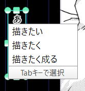 テキストを打ってる最中の予測変換なのですが、 文字にだだかぶりで前後の文字が見えなくて困ります。 ![]() ※ちなみに上の画像は「あいうえお、かき」まで打った状態 テキストはフキダシへの収まりを考えたり、 ひらがなばっかりや漢字ばっかりの読みにくい文章にならない様に気をつけたり なおかつ、伝わりやすい言い回しになる様に考えたりするので 是非とも改善して欲しいです。 よろしくお願いします。 ------------------------------------------------------------ ■バージョン: ※Windowsは、[ヘルプ]メニュー → [バージョン情報]で確認できます。 ※MacOSXは、[CLIP STUDIO PAINT]メニュー → [バージョン情報]で確認できます。 ■グレード DEBUT( ) comico( ) PRO( ) EX( ) ■OS Windows XP( ) Windows Vista( ) Windows 7 ( ) Windows 8( ) Windows 8.1( ) Windows 10( ) MacOS X 10.5( ) MacOS X 10.6( ) MacOS X 10.7( ) MacOS X 10.8( ) MacOS X 10.9( ) MacOS X 10.10( ) MacOS X 10.11( ) その他( ) ------------------------------------------------------------ |