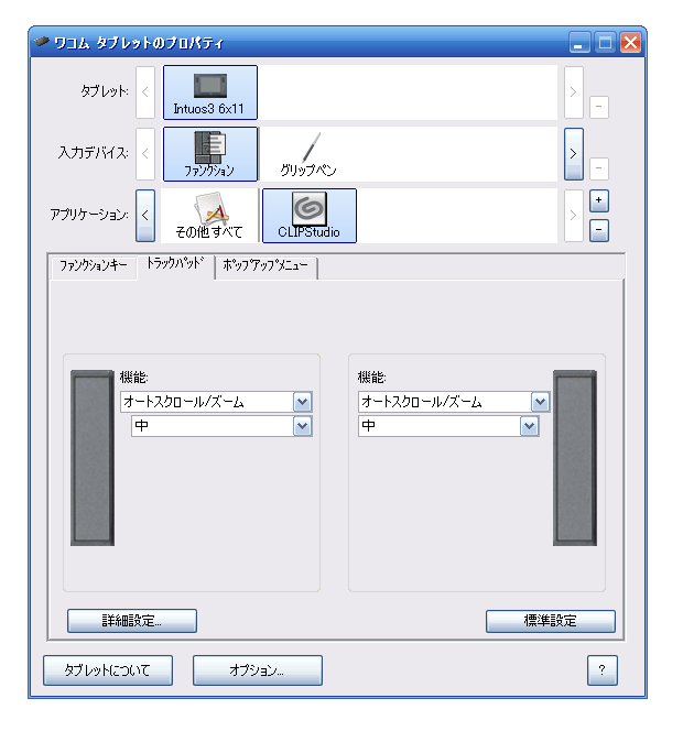 また、ワコムタブレットのプロパティのファンクショントラックパッドで