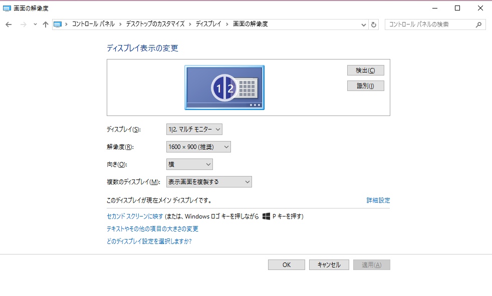 を選択し、[ディスプレイ]を選択して、表示される画面の左側で[解像度の調整]