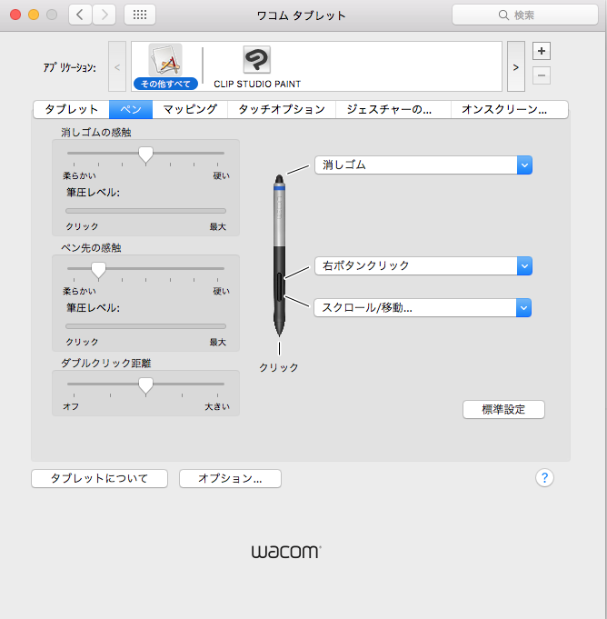 ・[ワコムタブレットのプロパティ]のペン設定が確認できる状態の